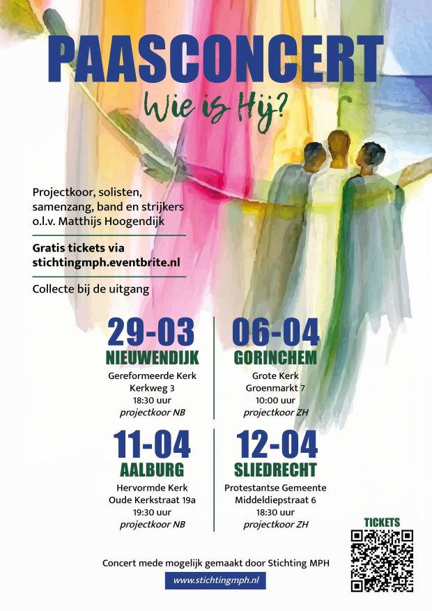 SLIEDRECHT – Stichting MPH (Muziek Producties Hoogendijk) organiseert een Paasconcert met als thema: ‘Wie is Hij’. Met medewerking van: Projectkoor ZH, solisten, samenzang, band en strijkers onder leiding van Matthijs Hoogendijk.