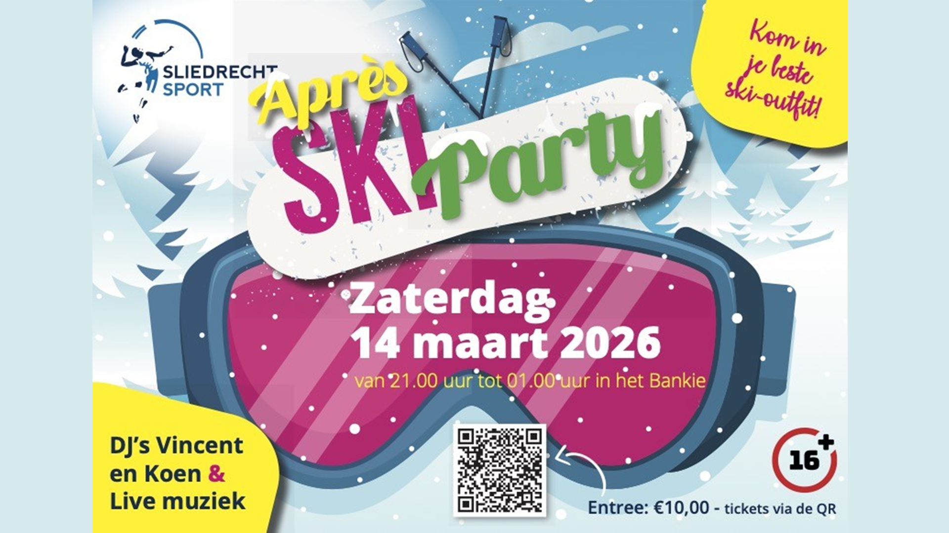 Ben je 16 jaar of ouder, dan ben je van harte welkom. Voor de echte feestbeleving kom je natuurlijk in (après-)ski kleding, maar ook zonder ben je welkom. Geef er dan in ieder geval een winters tintje aan. Tschüss!