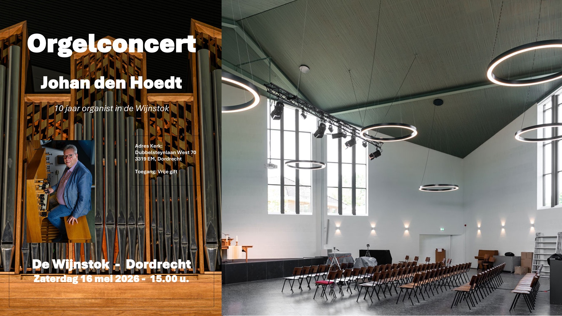DORDRECHT Om 15:00 uur geeft Johan den Hoedt een orgelconcert in de Wijnstok te Dordrecht. Met dit concert viert hij dat het deze maand 10 jaar geleden is dat hij benoemd werd als organist van deze kerk.