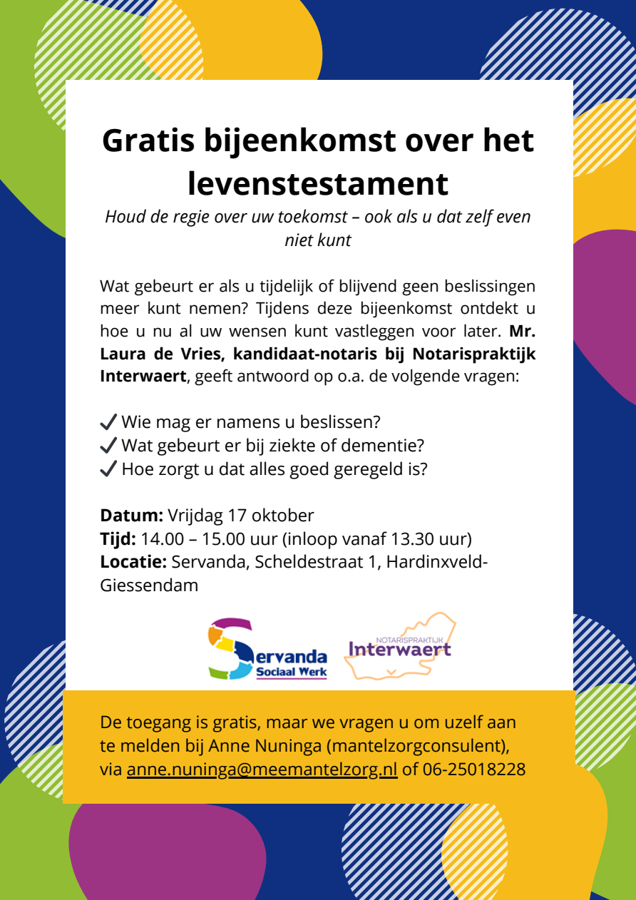 H’VELD-G’DAM – Houd de regie over uw toekomst – ook als u dat zelf even niet kunt. Wat gebeurt er als u tijdelijk of blijvend geen beslissingen meer kunt nemen? Tijdens deze bijeenkomst ontdekt u hoe u nu al uw wensen kunt vastleggen voor later. Mr. Laura de Vries, kandidaat-notaris bij Notarispraktijk Interwaert, geeft antwoord op onder andere de volgende vragen: