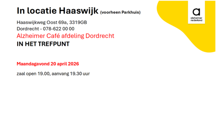 DORDRECHT – Alzheimer Café in locatie ‘Haaswijk”(voorheen het Parkhuis) Haaswijkweg Oost 69a te Dordrecht. In het trefpunt. Zaal open 19:00 uur, aanvang 19:30 uur.