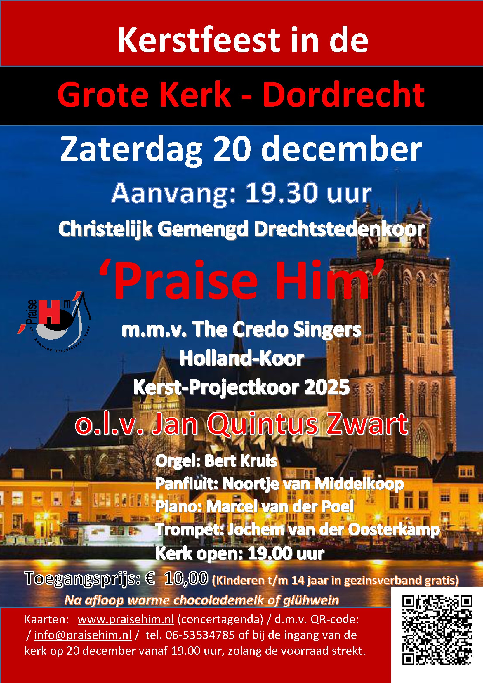 Zet de datum alvast in uw agenda: 20 december. Vanaf 19:00 is de kerk open en de avond begint om 19:30 uur. De toegangsprijs is 10 euro (kinderen t/m 14 jaar in gezinsverband gratis). Kaarten: via de QR code op de poster en op: www.praisehim.nl/concertagenda. Ook via: info@praisehim.nl; telefoon: 06 – 53 53 47 85 of bij de kerk vanaf 19:00 uur (zolang de voorraad strekt).