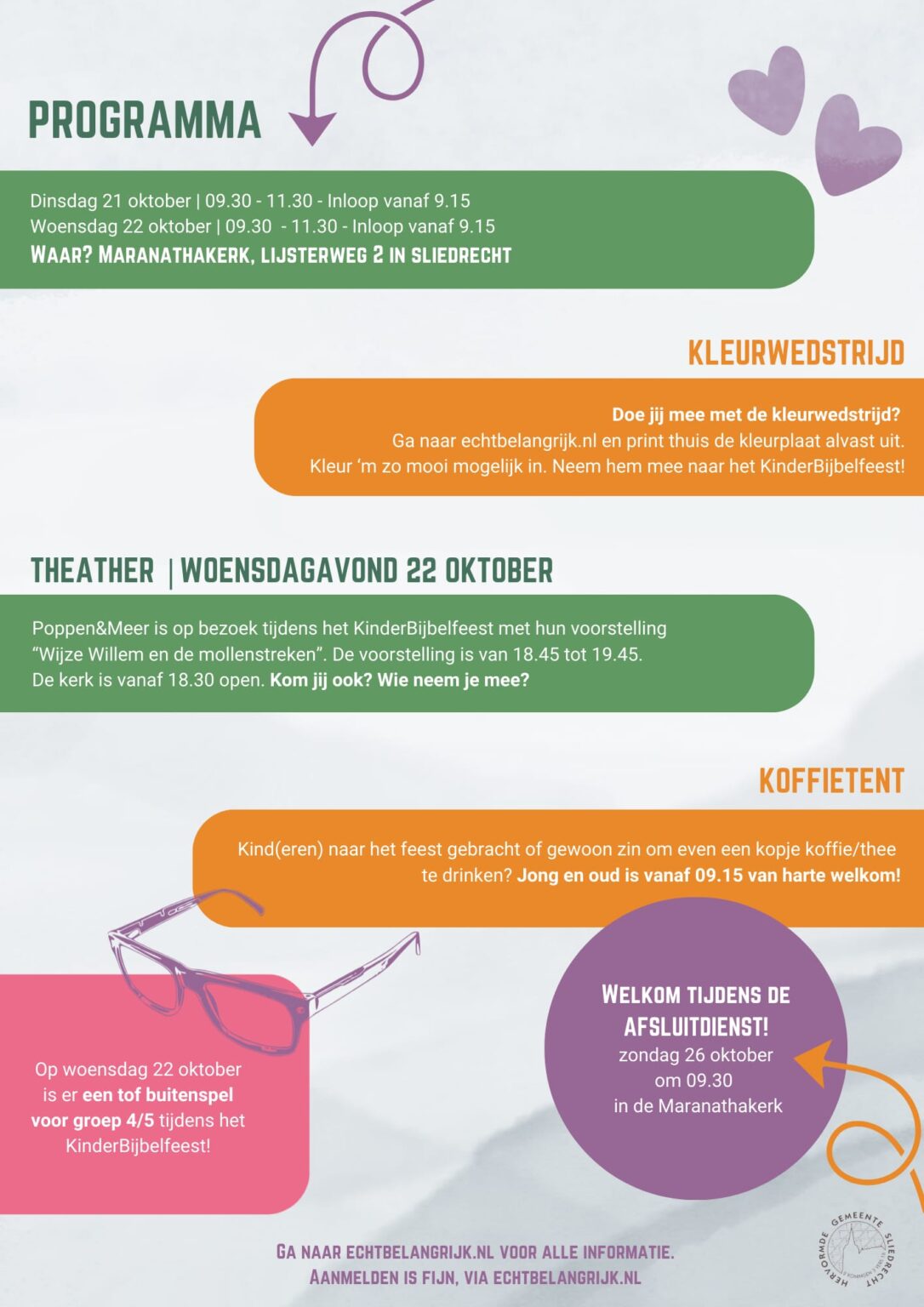 - Het KinderBijbelfeest vindt plaats in de Maranathakerk, Lijsterweg 2 in Sliedrecht.