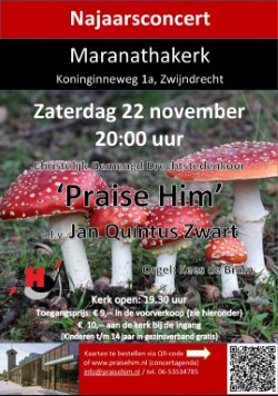 ZWIJNDRECHT – Het Christelijk Gemengd Drechtstedenkoor ‘Praise Him’ geeft een concert in de Maranathakerk in Zwijndrecht. Het is het eerste in een reeks mooie concerten. De avond staat natuurlijk onder leiding van dirigent Jan Quintus Zwart en achter het orgel zit Kees de Bruin. Het belooft een mooie avond te worden.