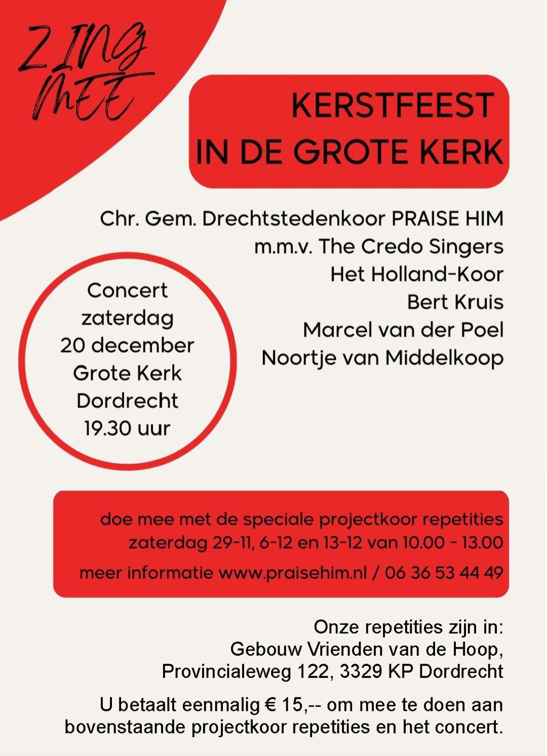 De repetities vinden plaats in Dordrecht bij ‘Vrienden van de Hoop’, Provincialeweg 122. Informatie: info@praisehim.nl of telefonisch: 06 – 36 53 44 49.