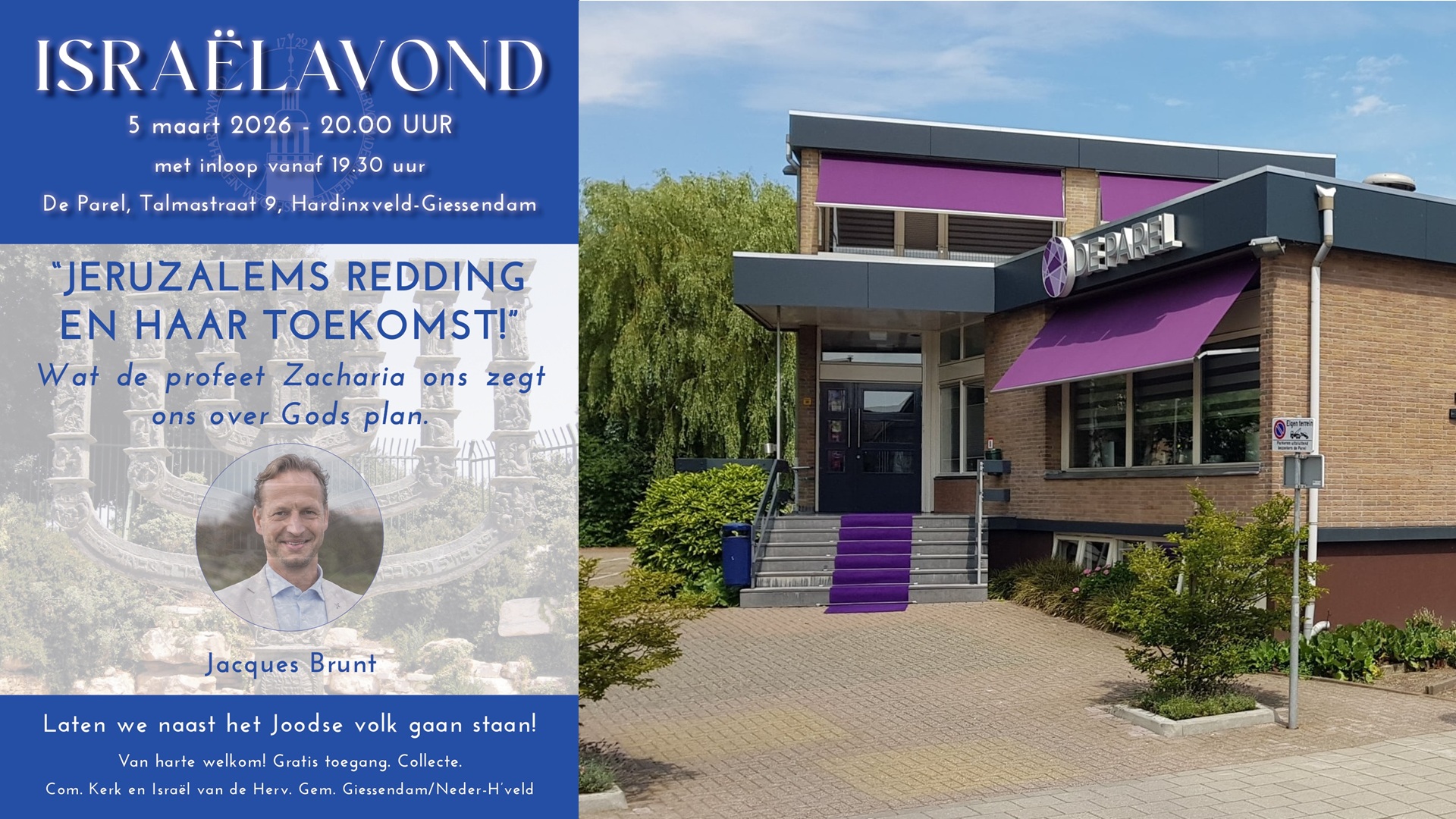 In ‘De Parel’, Talmastraat 9, Hardinxveld-Giessendam. Aanvang 20:00 uur. Inloop vanaf 19:30 uur. Israëlproducten, boeken, collecte. Hartelijk welkom!
