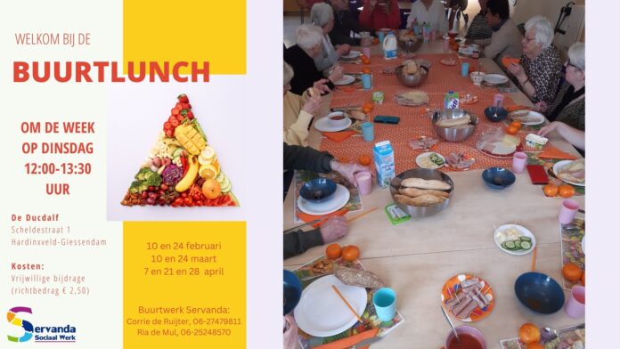 H’VELD-G’DAM – De buurtlunch bij Servanda wordt vanaf februari op dinsdag om de week gehouden. Inwoners zijn vanaf 12:00 uur welkom voor een gezellige lunch met soep, brood en ander lekkers. Aanmelden is niet nodig. We vragen een vrijwillige bijdrage (richtbedrag minimaal €2,50).