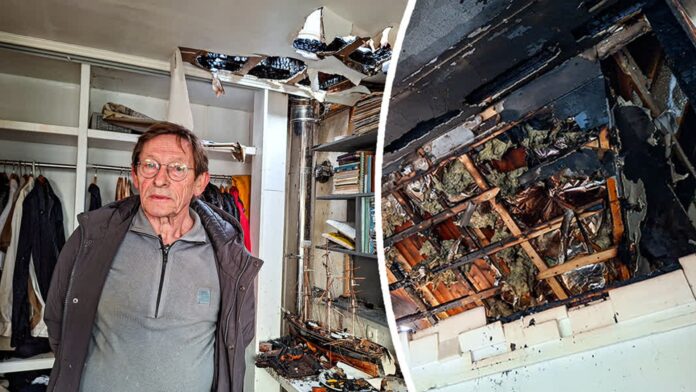 Zijn vloerkleden in de woonkamer kun je uitknijpen, want de waterschade in zijn huis is flink. In de keuken staat nog een pan spruitjes en een bakplaat met aardappelpartjes. ‘Ik was met het avondeten bezig toen er werd gebeld. Ik deed open en een voorbijganger zei dat mijn dak in brand stond. Ik had het zelf niet in de gaten’.