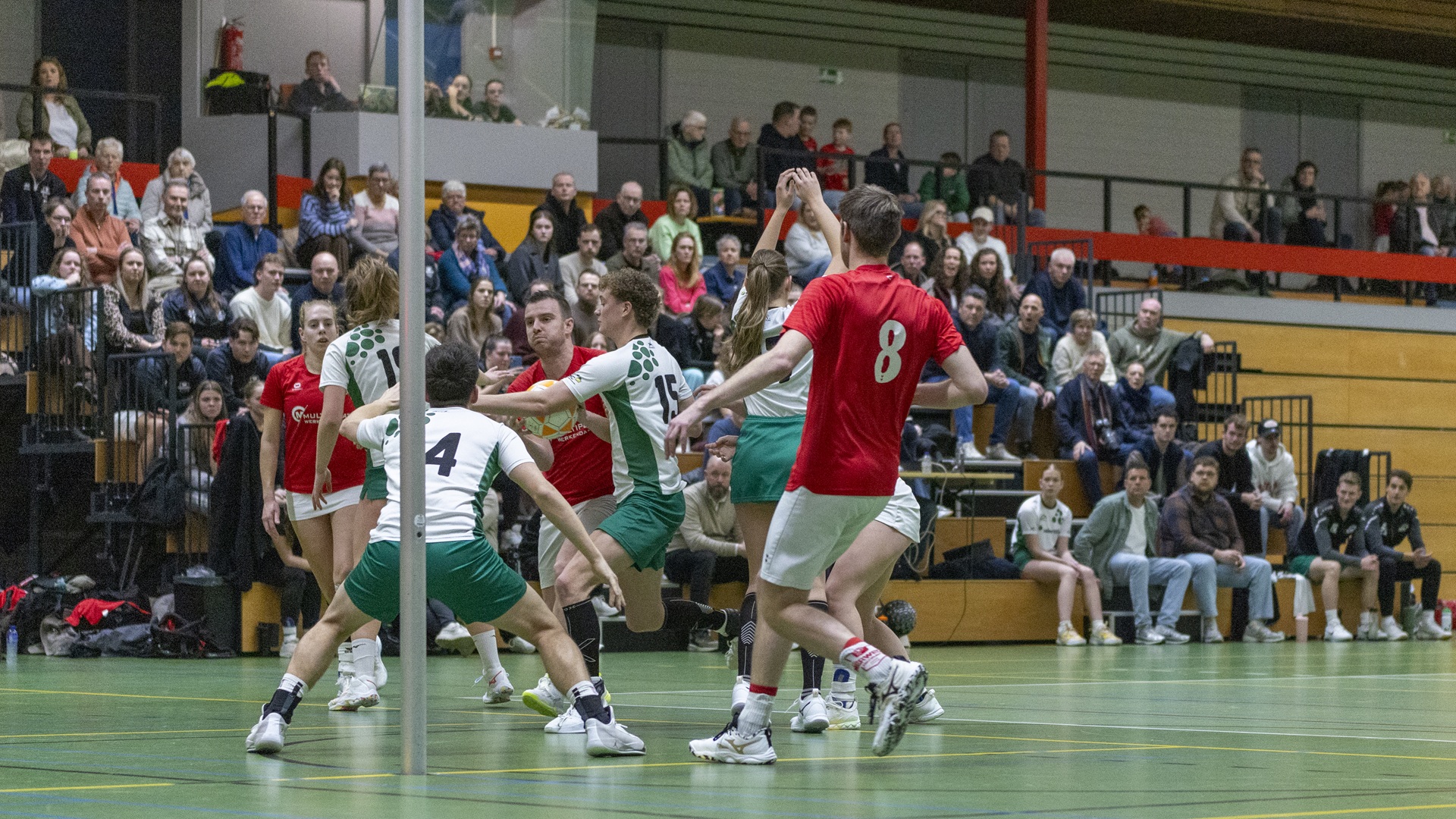 Merwede/Multiplaat speelde volwassen en geduldig, met veel controle en variatie in de aanval. Zeven van de acht basisspelers wisten voor rust al te scoren, wat resulteerde in een comfortabele 19-9 ruststand.