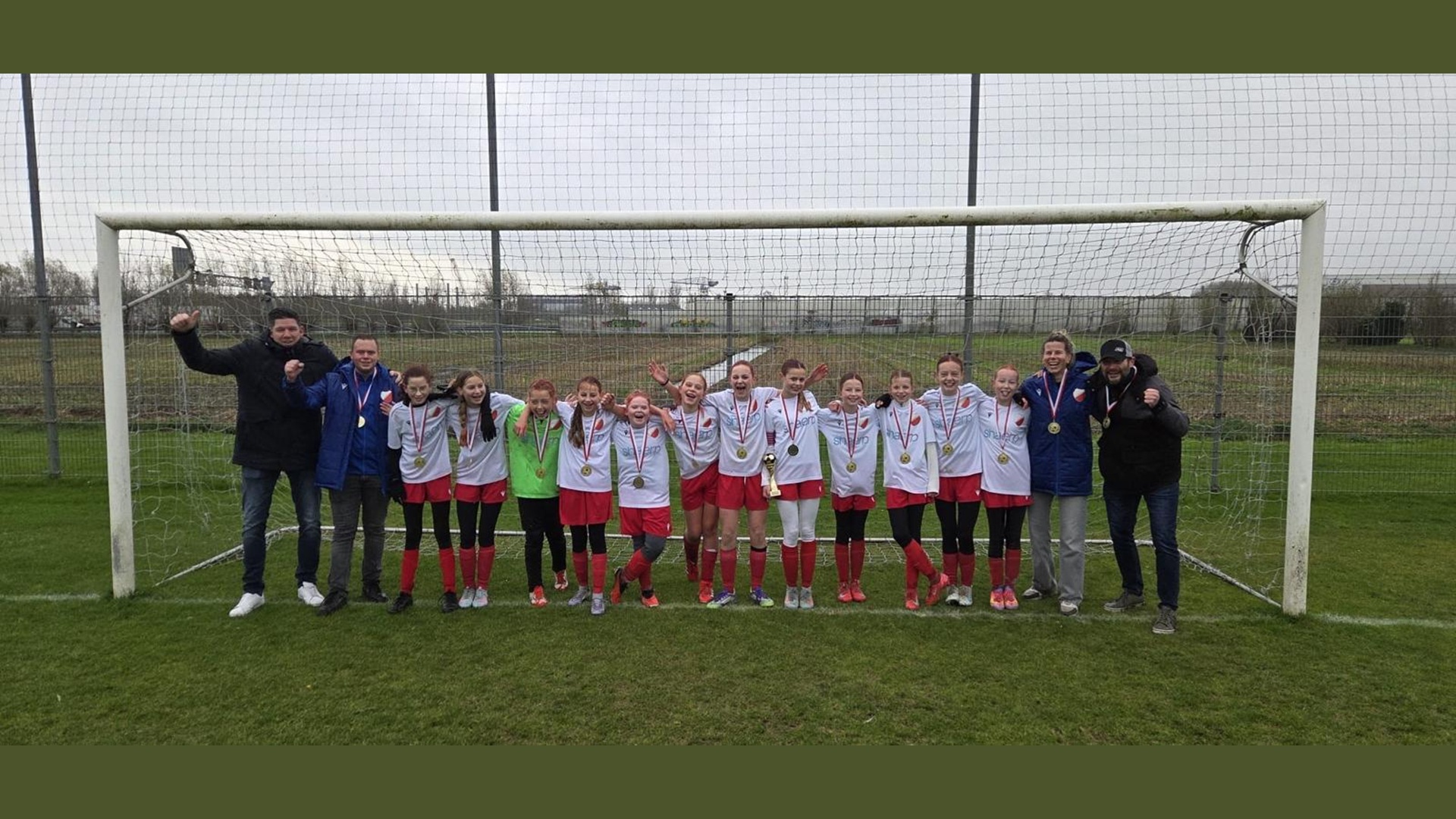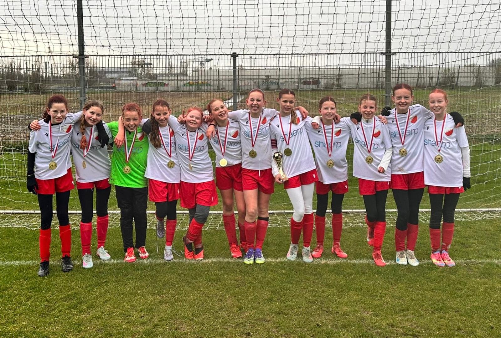 Trainers Michael Coenradie en Marieke de Bruijn-Biemans zijn zeer trots: ‘De meiden hebben enorme strijdlust en inzet getoond. Het is een hecht team dat de afgelopen maanden ontzettend is gegroeid. Dit kampioenschap is een prachtige beloning voor hun harde werk’.