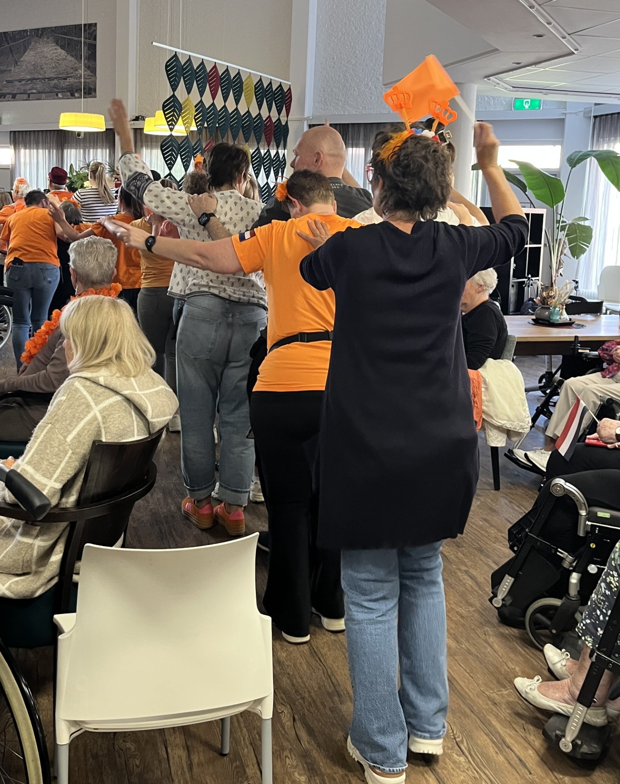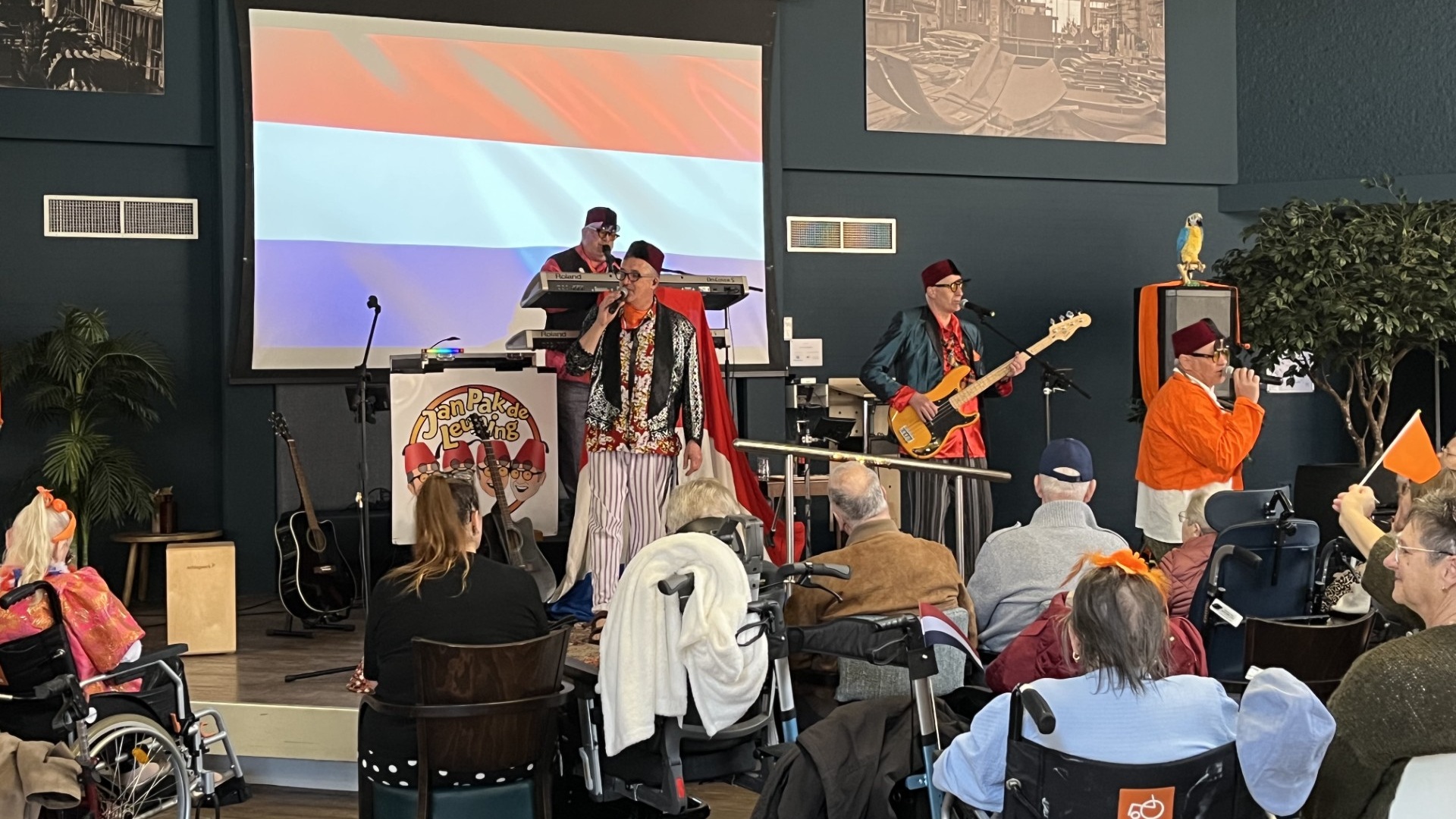 SLIEDRECHT – Met dank aan de Stichting Vrienden van Waerthove en de afdeling Welzijn van dit verpleeghuis, kon er op Koningsdag in de grote Biesboschzaal met de band ‘Jan Pak de Leuning’ uit Sliedrecht een leuk feestje gevierd worden, inclusief een polonaise. De Vrienden hebben besloten ook dit jaar elke maand een muzikaal programma aan de bewoners aan te bieden, en dat viel nu op Koningsdag.