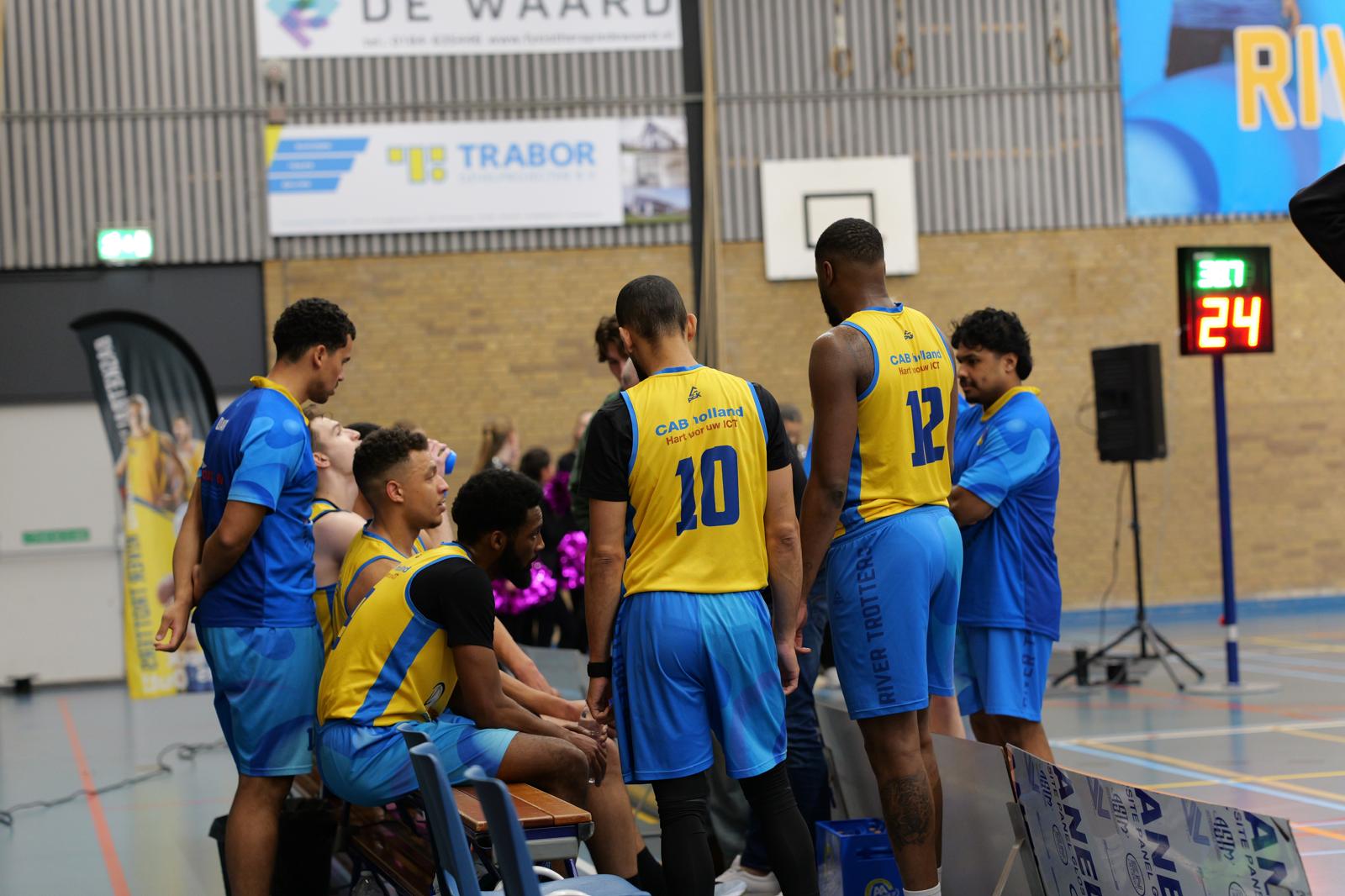 H’VELD-G’DAM – In een gezellige en goed gevulde sporthal De Wielewaal stond zaterdag 14 maart de wedstrijd tussen River Trotters Heren 1 en BV Noordkop Heren 2 op het programma. Door een aantal afwezigen moest River Trotters het doen met een selectie van tien man, maar dat bleek uiteindelijk geen enkel probleem. De sfeer in de hal was uitstekend, mede dankzij een grote verloting met ontzettend veel prijzen én de cheerleaders van Dansstudio Jolynda, die het publiek en de spelers extra energie gaven.