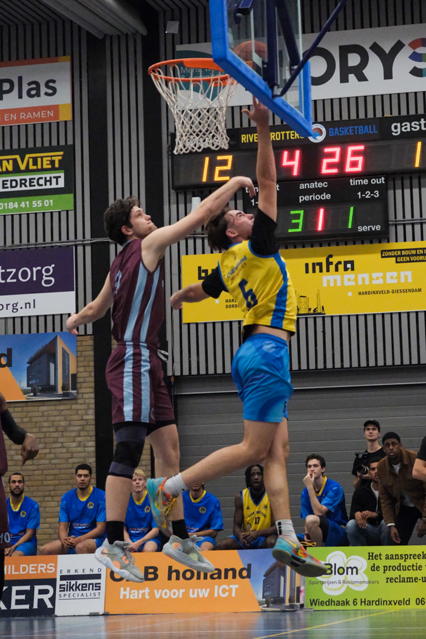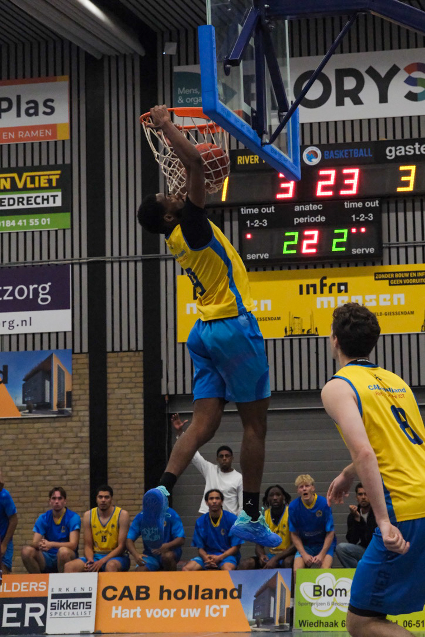 H’VELD-G’DAM – Afgelopen zaterdag 11 oktober stond sporthal De Wielewaal in het teken van een heerlijke basketbalavond. River Trotters Heren 1 nam het in eigen huis op tegen de Arnhem Eagles. De tribunes waren goed gevuld dankzij de gezellige sponsoravond, een verloting met mooie prijzen en een spetterend optreden van de cheerleaders. Alles was aanwezig voor een topavond – en dat werd het ook, al maakten de Trotters het zichzelf spannender dan nodig.